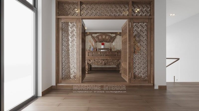 Mẫu thiết kế bàn thờ hiện đai kết hợp vách cnc gỗ màu tự nhiên tạo giúp tách biệt không gian,tạo vẻ đẹp sang trọng