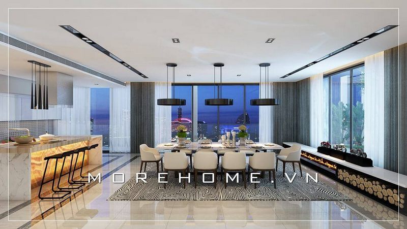 Với cấu trúc loại hình nhà cao cấp, thì các phòng ăn và phòng khách thường liên thông với nhau, loại bỏ những bức tường cứng nhắc. Việc sắp xếp bài trí phòng ăn phải đảm bảo cân đối với nội thất đảm bảo sự hiện đại, sang trọng và tiện lợi cao.
