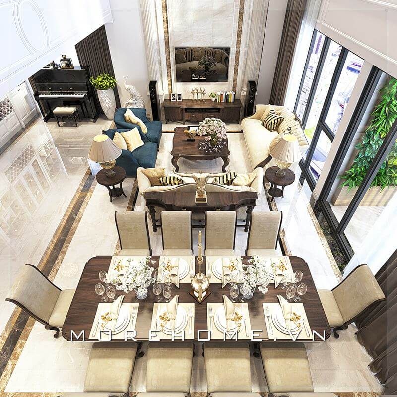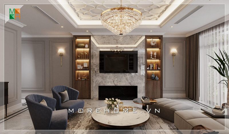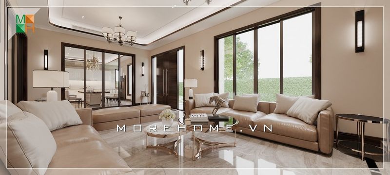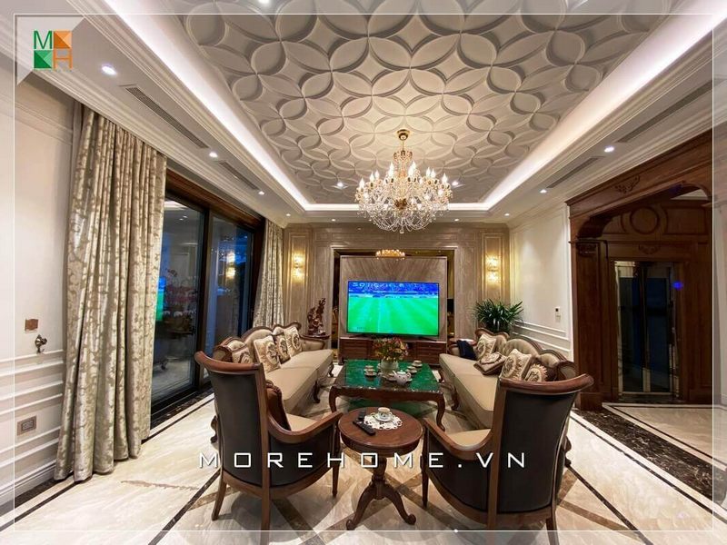 Phòng khách biệt thự được thiết kế mang phong cách tân cổ điển đẹp, sang trọng giúp tôn lên giá trị thẩm mỹ cho không gian căn phòng.