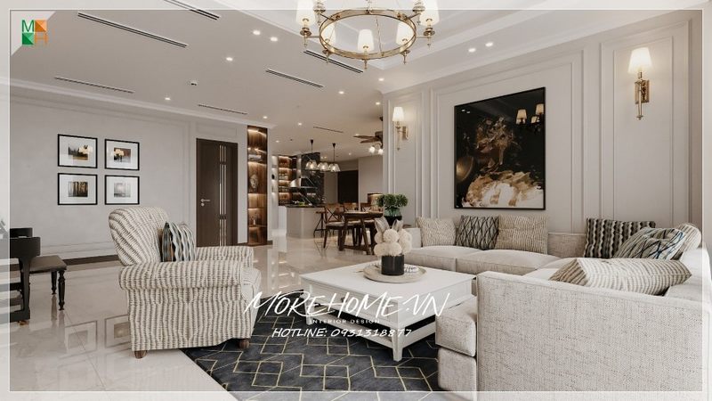 Thiết kế nội thất phòng khách chung cư cao cấp tân cổ điển nhẹ nhàng, với cách kết hợp sofa màu xám cùng với tone màu sơn tường trắng tinh tế tạo hiệu ứng nhẹ nhàng, thanh thoát.