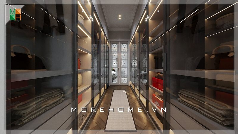 Mẫu nội thất tủ quần áo hiện đại, kết hợp giữa kính và gỗ, mang lại sự tiện nghi, cao cấp và sang trọng cho thiết kế nhà phố.