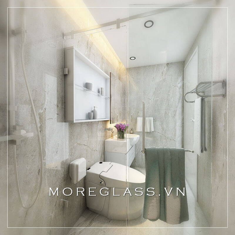 Mẫu thiết kế nhà tắm nhỏ này được trang bị phòng tắm kính đẹp, có cách sắp xếp nội thất, thiết bị vệ sinh hợp lí giúp tạo ra không gian thông thoáng cho căn phòng tắm nhỏ.